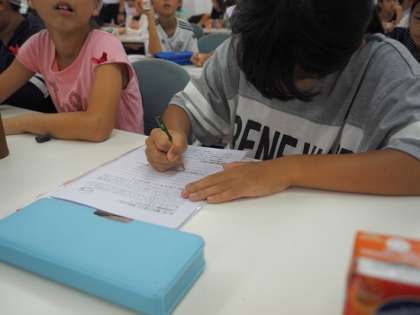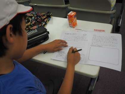 キャンパス内のいろいろな施設の見学を終えた子どもたちは、大きな教室に戻りました。そして、見学のしおりに見学のまとめをしていました。