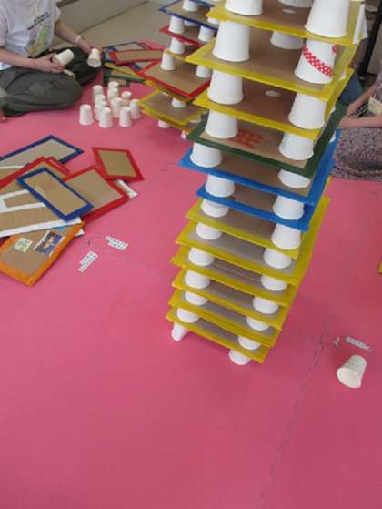 幼稚園や保育園、小学校の先生になるための勉強をしている児童学科の学生さんたちは、自分たちで遊びを工夫して、いろいろな遊びのコーナーを作ってくれていました。