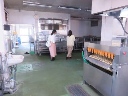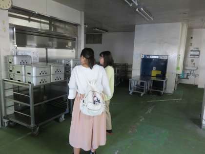 栄養士の仕事について調べることをテーマにしていた中学生でしたので、本校の栄養士さんが、いろいろとお話をしました。お話だけでなく、実際に給食室(夏休みの期間になり、2学期の給食開始前に点検・清掃をするため衛生検査を受けていない生徒も入室ができます。)を見てもらいました。