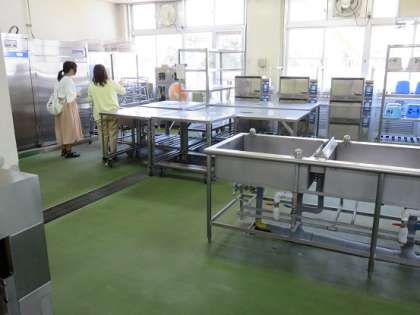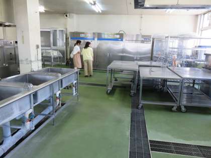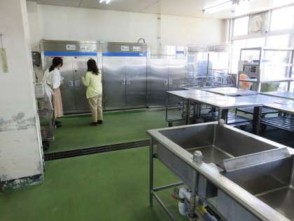 小学校の一年生のときに、『校内めぐり』の学習で、給食室の中での学習をしていますが、その時から、大型炊飯器が新しく設置されたりしており、椚田中学校の生徒さんは、給食室の内部の様子を興味深く見れらていました。