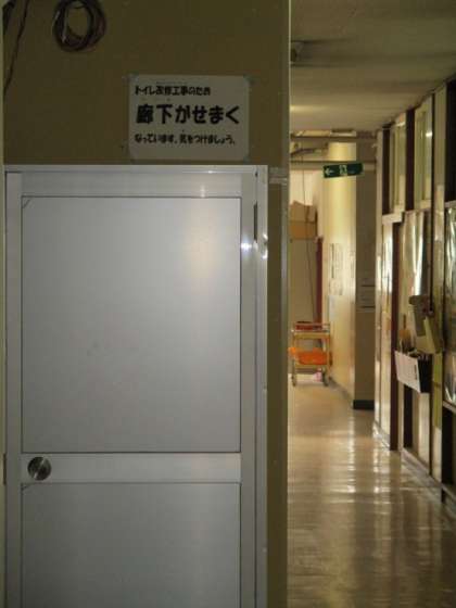 北校舎トイレ改修工事の解体作業が本格化しています。廊下等に工事区域の仮囲いがしっかりと設けられています。廊下のスペースが狭くなっておりますので、ご来校の際は、お気をつけください。