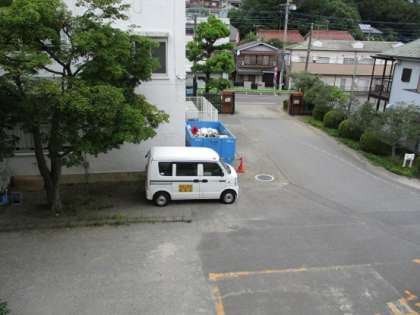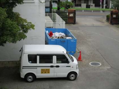 工事作業区域には、学校職員も入れませんが、駐車場の様子からも、工事の進捗がうかがえます。天井材などの解体された廃材が、駐車場に設置された容器に溜められています。