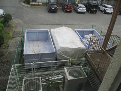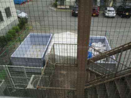 解体され、出たコンクリートガラの廃材も、容器に溜められています。廃材の飛散防止も含めて、シートがかけられいます。