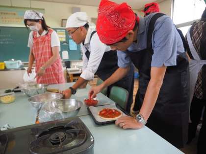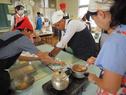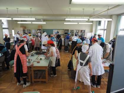 受講された先生方は、早速、調理実習を始めました。6〜7人を1グループの6つのグループを編成し、初めて出合った先生方同士の方も多く見られました。