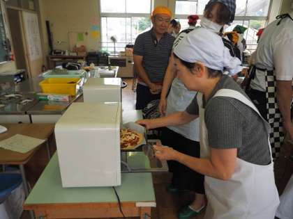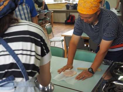 ピザ生地を伸ばしている『麺棒』は、本日の研修会講師の小口先生が、日頃、大学の授業等で使われている物です。小学校の家庭科室には、備えられていない道具類も、お借りすることができています。