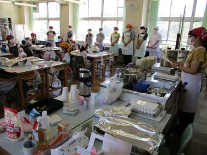 準備万端、『親子料理教室』が始まりました。この『親子料理教室』では、日頃、給食の料理をしていただいている給食調理の委託業者のスタッフの方にお手伝いをいただいています。