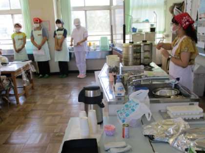 昨年度は、HITOWAフードサービスのスタッフに皆さんにお手伝いいただきましたが、3年に一度の契約更新に伴い、8月以降の給食委託業者が、株式会社トウショクとなりましたので、トウショクのスタッフの方に、この日の『親子料理教室』のお手伝いをお願いしました。快くお手伝いがいただけました。
