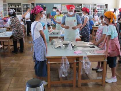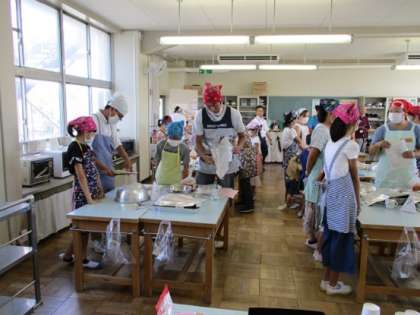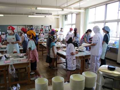 栄養士さんから、この日のメニューや作り方を教えていただいた子どもたちは、お家の人と、早速、調理作業に取り組み始めました。