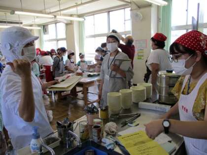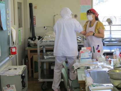 各班の親子で作ったピザトーストは、給食室に運ばれて、大型のオーブンで焼き上げられます。どのタイミングでオーブンで焼く作業をするなど、調理員さんと栄養士さんで打ち合わせをしました。また、給食室に入って作業をするため、給食調理の際に着用している専用の白い服装をしてもらっています。(トウショクのほかのスタッフの方は若草色のエプロンを着用されていました。)