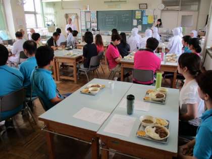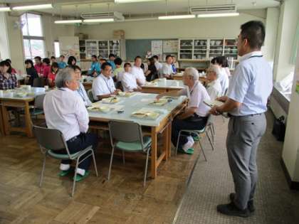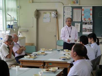配膳が終わり、副校長先生の司会のもと、試食会が始まりました。最初に、市教委の保健給食課の方からのごあいさつがあり、続いて、本校校長があいさつをしました。