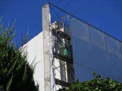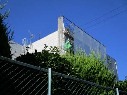 北校舎のトイレの解体作業もだいぶ進みました。足場を組んだ3階から、解体作業で出されたコンクリートガラを外に運び出していました。
