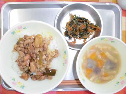 今日の主食は、「やきとり丼」です。やきとりの「ねぎま」をイメージして作っています。給食では、鶏肉と長ネギをオーブンで一度焼いてから、味を付けています。鶏肉の肉汁がたっぷり入ったタレは、ごはんの進む味です。