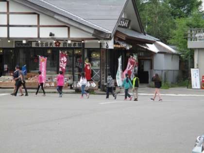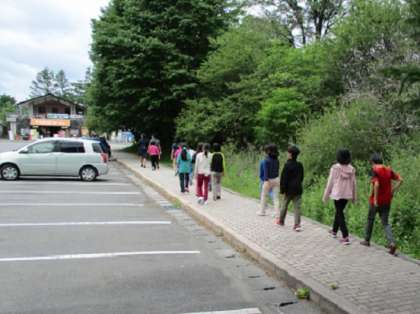 戦場ヶ原の中ほどにある三本松に到着した子どもたちは、男体山が見える場所に移動しました。