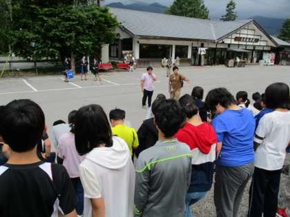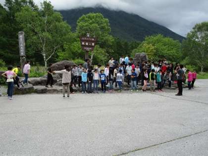 あいにくの曇り空で、男体山の山頂は雲で隠されていましたが、子どもたちは、男体山をバックに、学年全員で集合写真を撮影します。足元には、いろいろな大きさの岩でしたが、子どもたちが手際よく、はしゃぐこともなく、上手に集合写真の準備ができていました。