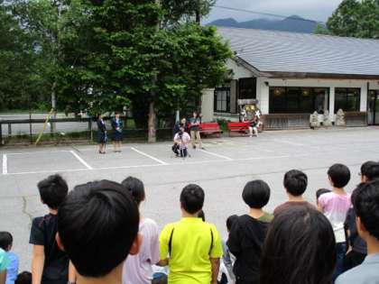 集合写真が美しく撮影できるようにと、カメラマンさんが調整している間、子どもたちが、ニッコリの笑顔になるようにと、バスガイドさんが、カメラマンさんの後ろでお茶目なパフォーマンスをしてくれて、子どもたちは、知らず知らずに笑顔になっていました。