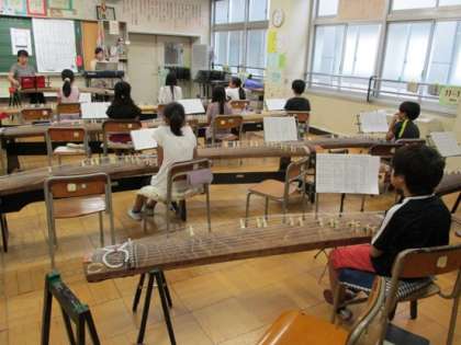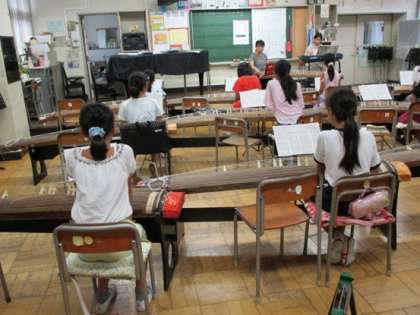 音楽クラブの子どもたちは、一人ひとりに配られた『荒城の月』のお箏の楽譜を眺めながら、二人の先生の演奏をしっかり聴いていました。