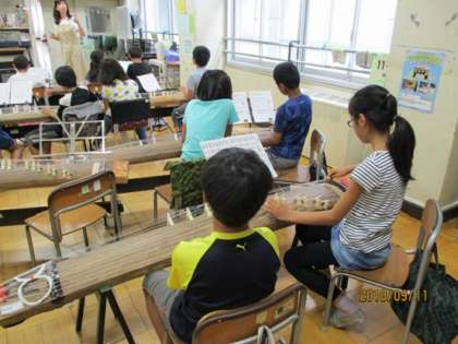 子どもたちは、二人組になってお箏の練習をしていました。本校には、10面ちょっとのお箏がありますが、子どもたちが二人組になったときに足りないお箏は、渡邉先生が先生のお箏を快く貸していただいています。