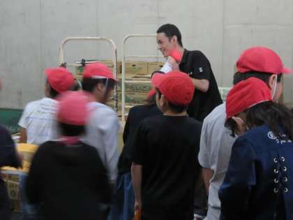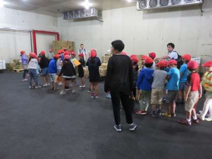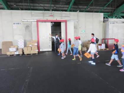 子どもたちは、市場内の『保管庫』について教えてもらいました。そして、保管庫の中で、野菜が新鮮に保たれる温度を体験しました。室温5度の温度に、子どもたちは、