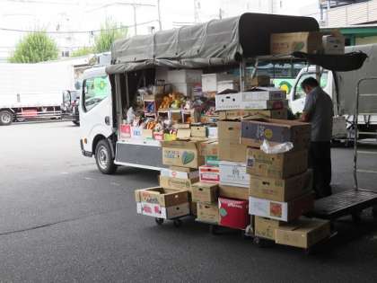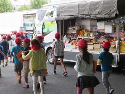 荷物を積み終えたら、八王子市内のいろいろな所で、移動販売所のお店を開くそうでした。今日は、20数カ所を予定しているとのことです。そして、館町のたてまち幼稚園のそばでもトラックを止めて、地域のお客さんに新鮮なお野菜などを販売するとのことでした。