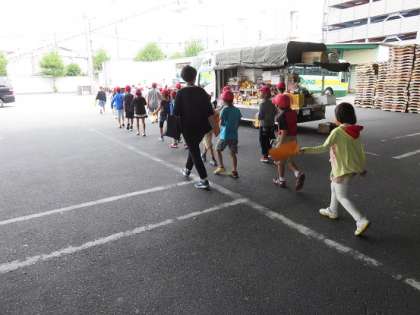 次の見学に向かうためにバスに向かう子どもたちのそばに、たくさんの野菜や果実などを積んだトラックがありました。お仕事の途中でしたが、校長先生が、トラックのところでお仕事をされている方にインタビューをしてくれました。