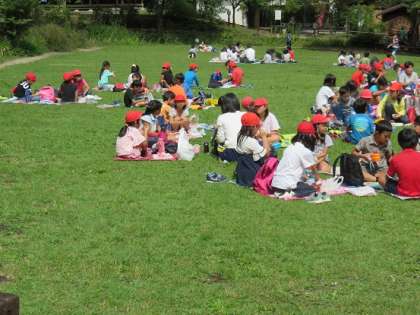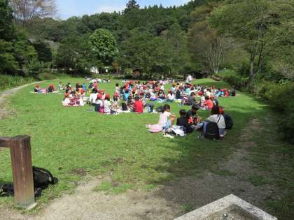 ふれあいの里の広場に着くと、市内の他の小学校の子どもたちが、お弁当をたべていました。横一小の子どもたちも、てきぱきと準備をして、お弁当タイムにしました。