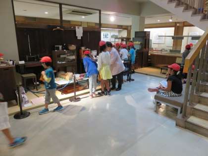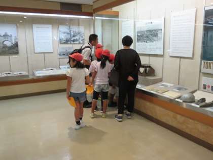 資料館の方からのお話をお聞きした後、子どもたちは、班ごとに館内の展示物の見学をしました。一日の見学で緊張感が薄くなってしまったのか、班ごとの見学では、見学時の声などが大きくなりがちで、来館された一般のお客さんへご迷惑をおかけしてしまいました。