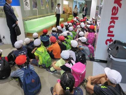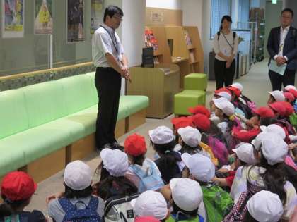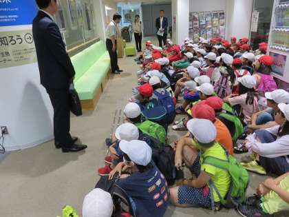 子ども科学館では、生憎の雨空だったため、館内の2階で科学館の方からのお話をお聞きしました。狭いスペースでしたが、子どもたちは譲り合って集合していました。