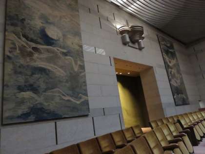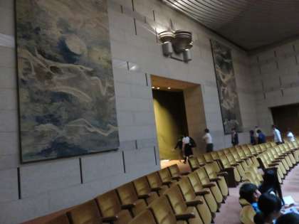 「大法廷には、前と後ろに、西陣織の大きなタヘストリーが4枚掛けられています。絵柄は、太陽と月を表しています。また、このタペストリーは、石のすき間と同じように、音の吸収の働きもしてくれています。」
