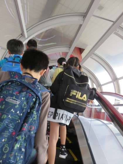 昼食を済ませた子どもたちは、長いエスカレーターに乗り、展示スペースに移動しました。