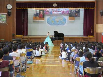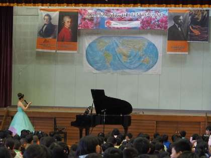 モーツァルトの『トルコ行進曲』やショパンの『小犬のワルツ』、ドビッシーの『金色のさかな』など、レーザーポインターで作曲家の肖像画を示しながら、いろいろなお話をしていただきました。