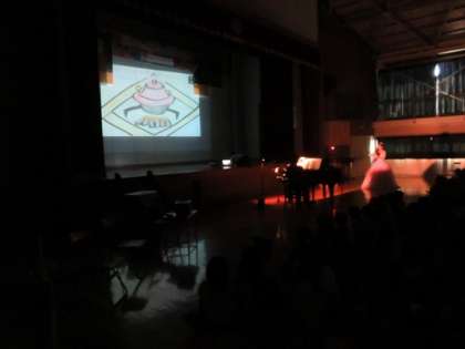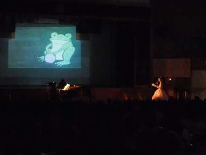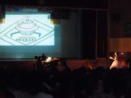 『よなか』のうたでは、本校の先生が描いた絵がスクリーンに映し出されて、絵と李枝先生のすてきな歌が重なって、子どもたちは楽しそうに見入っていました。
