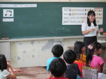 この日の授業のめあては、『リズムにのいって、明るい声ではずんで歌おう。』です。付点八分音符と16分音符でできているリズムを、子どもたちが覚えやすい『スキップちゃん』と呼びながら、感じ取らせていました。