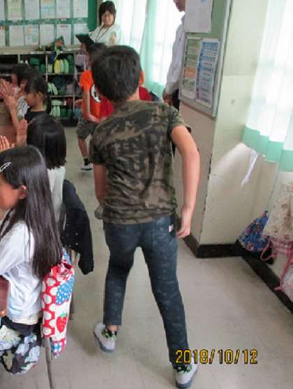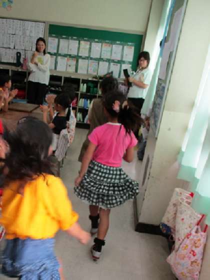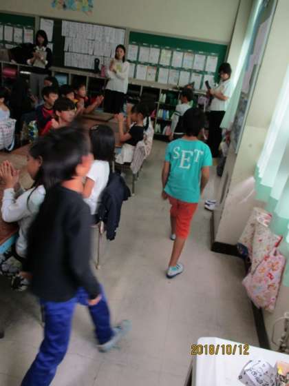 教室の真ん中に机を移動して、“スキップの歌”に合わせて、班ごとに、子どもたちは、リズムを意識して体を動かしていました。