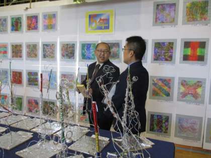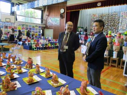 各学年の子どもたちの作品をじっくりご覧になられていました。そして、副校長先生より、作品を仕上げる場面での子どもたちの工夫の様子や頑張っていた姿をお話しました。