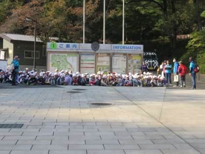 たくさんの動物を見ることができた1・2年生の子どもたちは、正門近くのトイレを済ますと、4台の借り上げバスに分乗して学校に戻りました。2年生のバスの中では、3年生の市内めぐりに向けて、北野街道などの様子を、車窓から見ながら勉強をしていました。