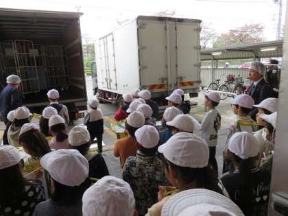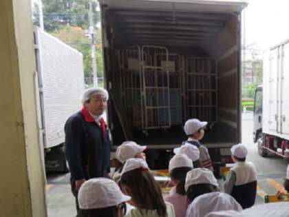 いろいろな所から品物が運び込まれる『商品の搬入口』の見学も、子どもたちはしました。商品を乗せて運ぶ専用のカートについて教えてもらっていました。