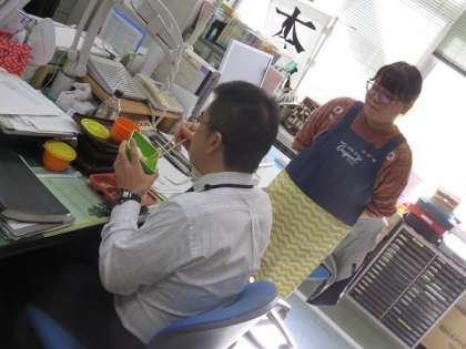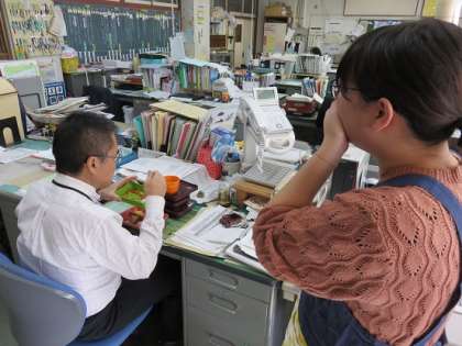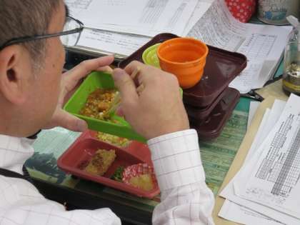 副校長先生が検食する横で栄養士の先生が、デリバリーランチの感想をインタビューしていました。