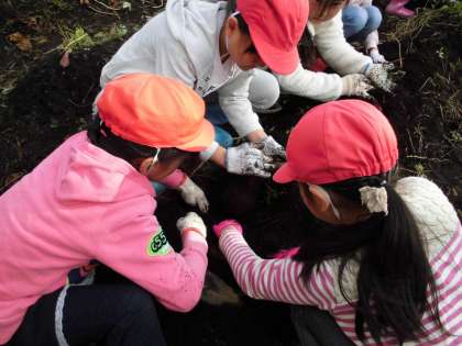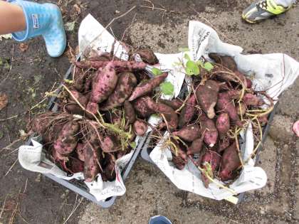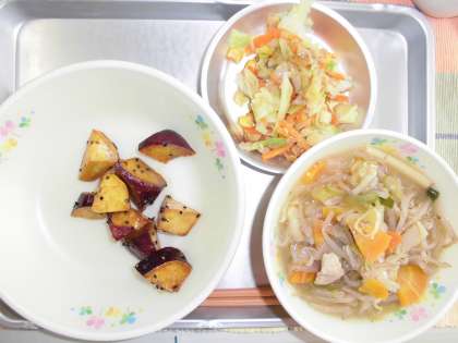 今日の大学芋は、2年生のみなさんが1学期に中庭の畑にさつまいもを植え、一生懸命育ててくれた特別なものです。大きく育ったさつまいもは、11月14日に収穫しました。2年生のみなさんが上手に収穫してくれたので、全部で44kg収穫することが出来ました!ホクホクしたおいしいさつまいもです。
