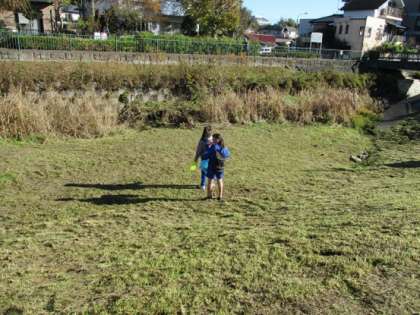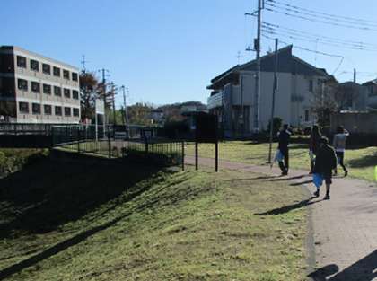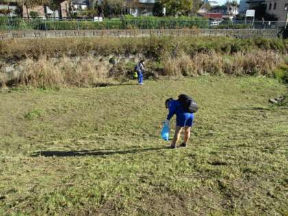 やざき公園に集合した方々は、4つにコースを通って、終点の椚田中学校を目指します。通り道では、中学生が湯殿川の緑地の奥まで、ゴミを広いに行っていました。