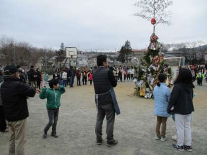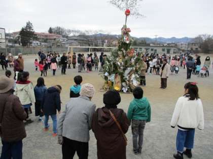 やぐらに火を着ける予定時刻の1時30分になると、多くの方が校庭に集まっていました。横一小にお子さんやお孫さんも通われていない、地域の高齢者の方の姿も見かけられました。