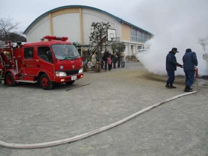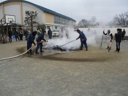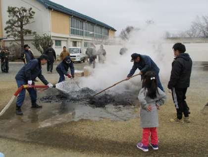 消防団のポンプ車から、熾火に向かって放水をしていただきました。火種が残らないようにとしっかりと水をかけていました。