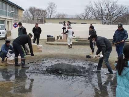 消火でたくさんの水を含んだ熾火の灰は、校庭に残らないようにと、横一親子クラブの皆さんが、段ボールの箱に集めてきれいに片付けていただいていました。