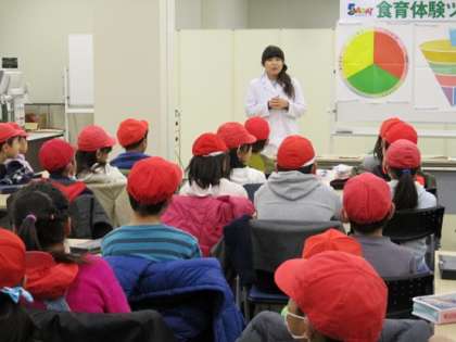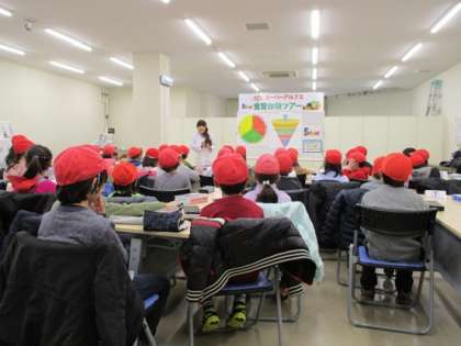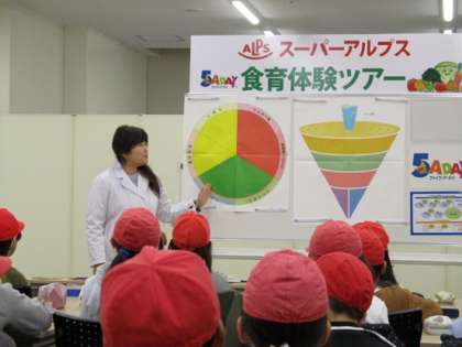 スーパーアルプスはざま店のお店の中にある研修室で、3年生の子どもたちは、最初に栄養士さんからお話を聞きました。