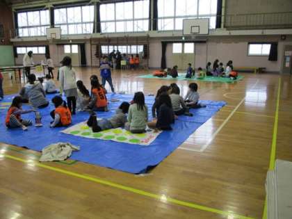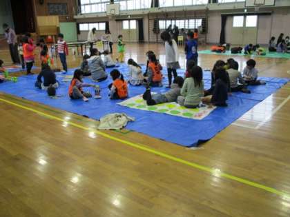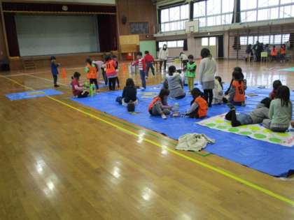 体育館に敷かれたブルーシートの所で、子どもたちはいろいろな遊びを楽しんでいました。