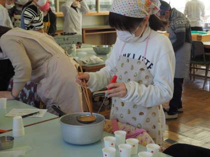 鰹節や煮干しで出しを取ってだし汁にみそを足して、みそ汁を子どもたちは作りました。