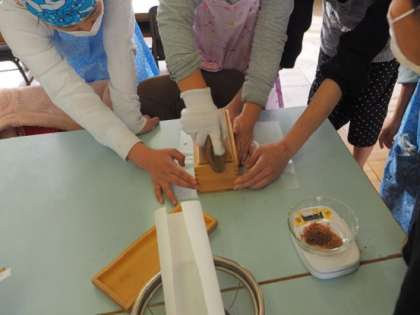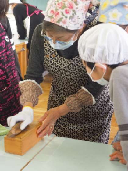 鰹節を鰹節削り器で削る方法を教えてもらい、子どもたちも実際に遣ってみました。