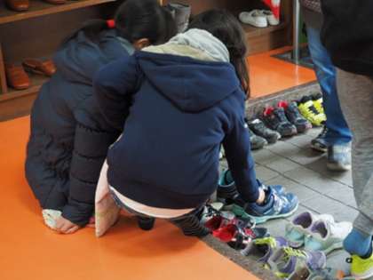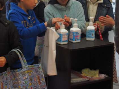 この茶道体験では、3つの学級がクラスごとに館町市民センターに移動して行いました。子どもたちは、靴を揃え、そして、手の消毒をして、市民センターを使わせていただきました。