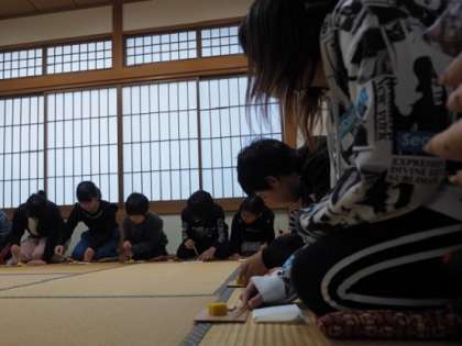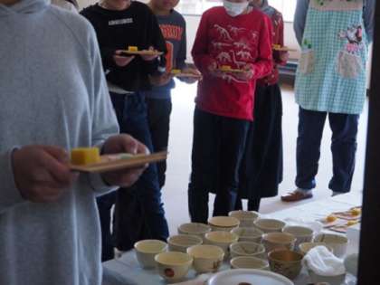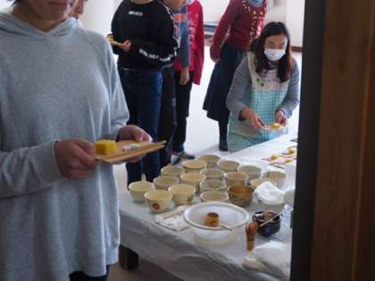 おもてなしの係の子どもたちは、茶菓子の和三盆のお菓子をお客様の子どもたちへお勧めをします。