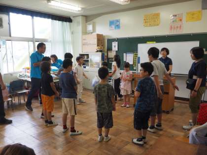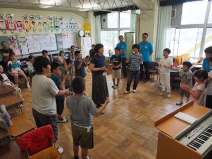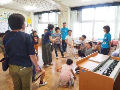 すみれ学級では音楽の授業をしていました。音楽講師の先生と一緒に、歌やリズム遊びを楽しんでいました。