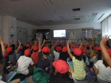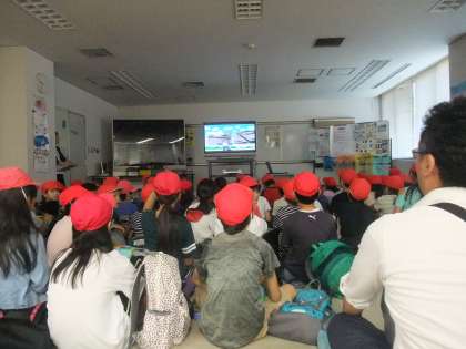 最初は全員で、ビデオを使って清掃工場の仕組みや役割、八王子市のごみの収集の状況などについて学びました。
